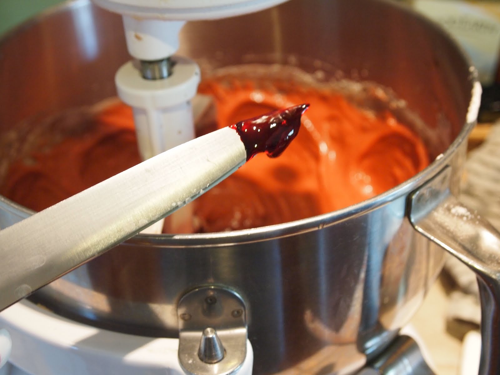 Add the color. If using the paste, add quite a bit, then stir and see if it's dark enough. Add more color to get it really red if it needs it. I use almost 1/2 a jar of the Wilton paste. If you are using the liquid, add the whole (1 oz.) bottle of liquid and mix well.